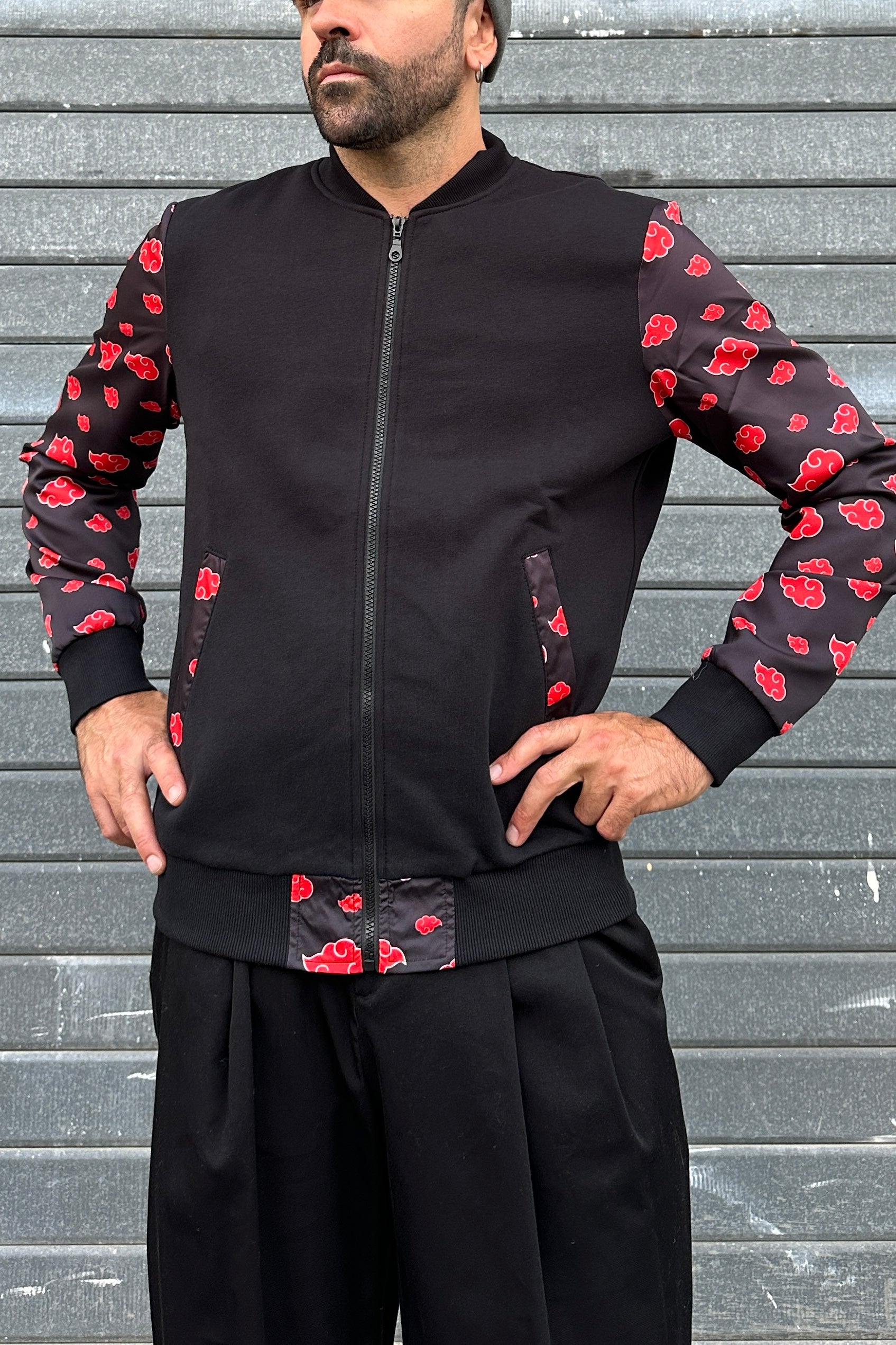 Zip centrale, tasche laterali con profilo in stampa e fondo rifinito a costine.