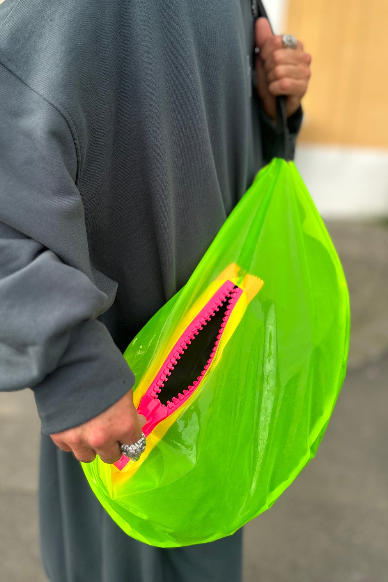 La zip nera classica e la maxi zip colorata aggiungono un contrasto dinamico e moderno. La bretella regolabile garantisce comfort e personalizzazione, mentre il grosso moschetto nero in plastica offre un tocco distintivo e pratico.